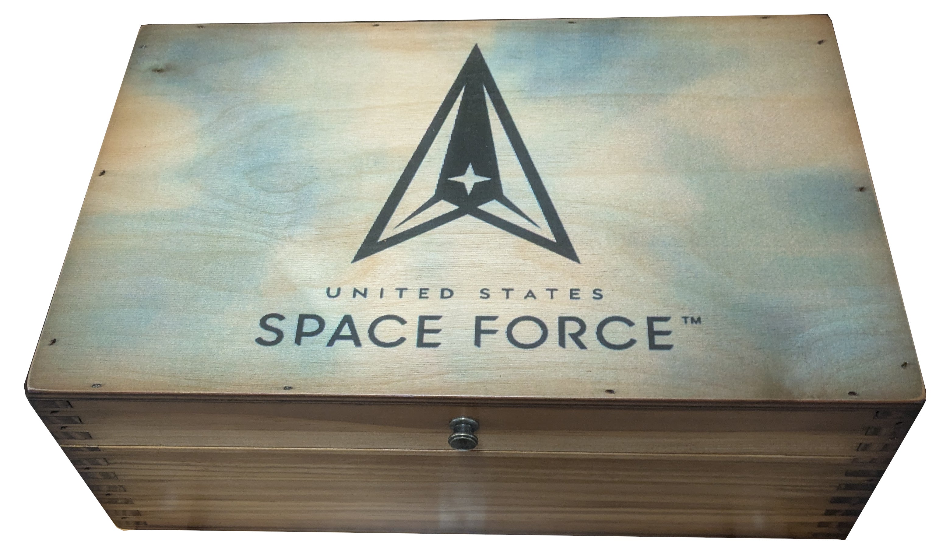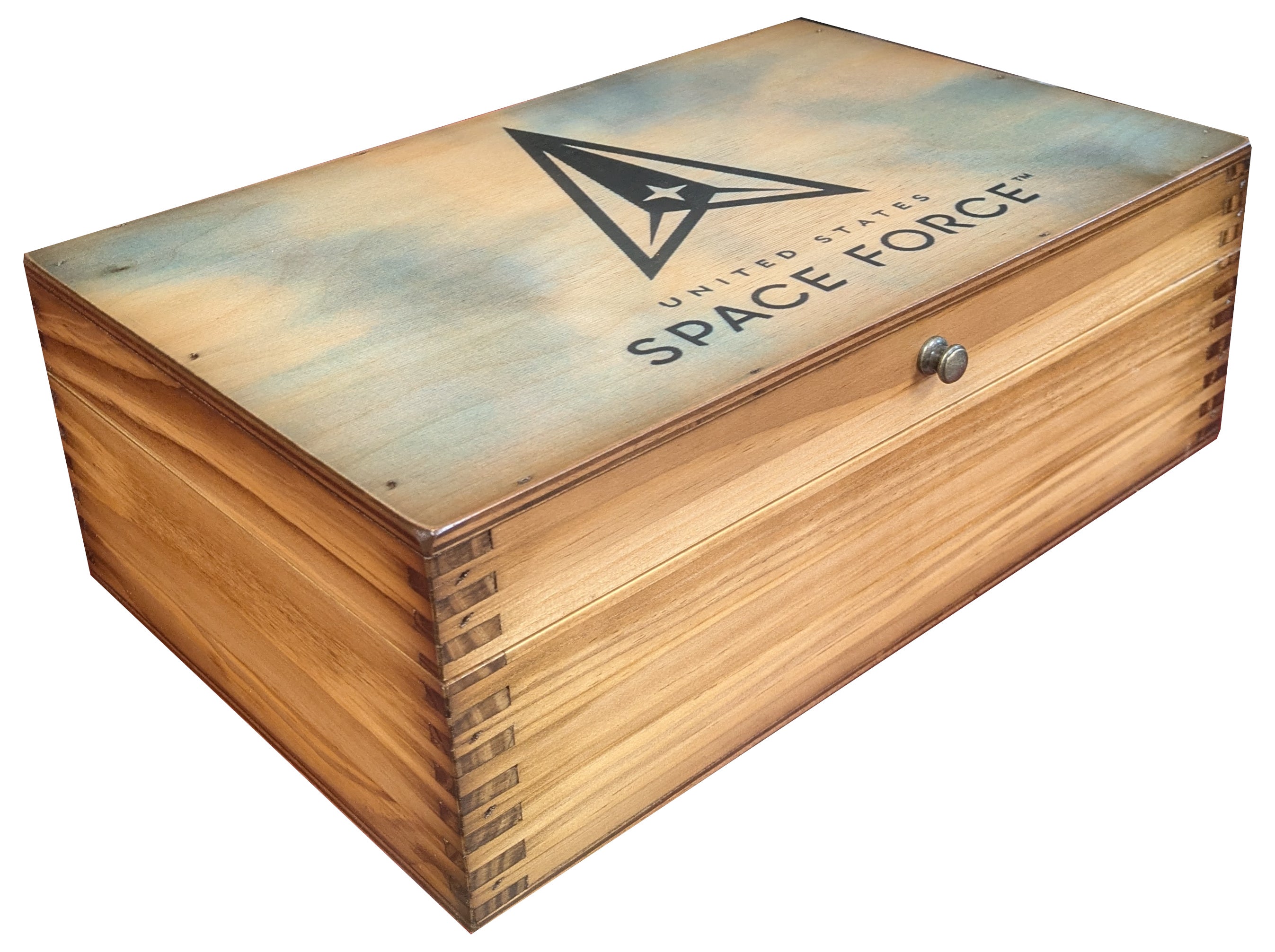 Officially Licensed United States Space Force Desk Box is individually hand crafted of pine. Hand sanded, distressed, sealed, shaded, and lacquered. Features a hinged top and pull knob. Perfect for desk or dresser for storing photos, wallet, medals and ribbons etc. for that special woman or man either currently serving or retired from the military. Lid and front features sublimated printed with U. S. Space Force Logo. Measures 14-1/2" x 9-1/2" x 5". Made in the USA.